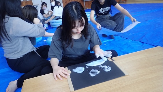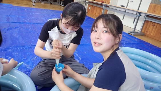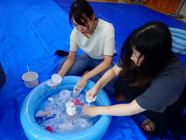7月6日(日)に行われる親子ふれあいフェスタにむけて、3日(木)のゼミの時間では、子どもの気持ちになりきって、泡という素材と関わりました。その中で、「こんな材料があったら面白いよね」「子どもはこんなことするだろう」と、自己の体験と予想される子どもの姿を結び付け、環境構成や保育計画について考えました。何より関わる保育者が素材の魅力や楽しさを知っていないと、子どもたちの体験やそこでの発見に共感したり、一緒に遊びこんだりすることはできません。今日は何よりみなが楽しそうに取り組む姿が印象的でした。