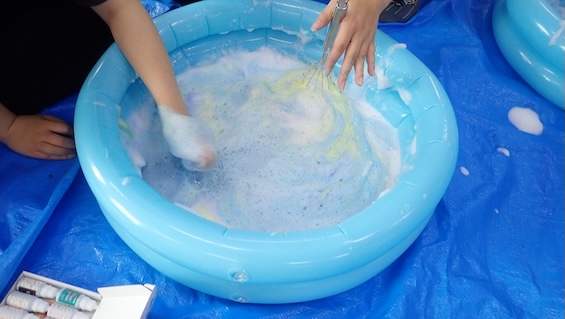 キッチン道具で泡つくり!色もつけて感触も楽しい!