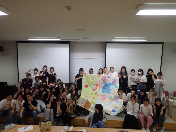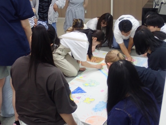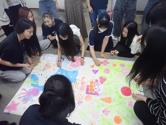 子ども教育学科幼稚園教諭・保育士コース1年生「幼児と環境」の最終授業が、7月22日(火)に行われました。今まで、取り巻く環境が子どもに与える影響や、環境との対話の中で生まれる活動・遊び、そしてそこから生まれる子どもの育ちについて学んできました。最終回は、一人一色クレヨンを選び、4グループに分かれて友達と大きな紙に自由に絵を描きました。時間がたつと、2グループの絵を合体、さらに時間がたつとすべての絵を合体させ、友達も、色も徐々に増えていく中で、お絵描き遊びを楽しみました。学生は、自分は一色しかないけれど、友達と協力することで描きたいものが表現できる喜びや、事前に何を描くか見通しをもって話し合ったり、たまたま描いたものが友達の描き足しで予想外のものに変わったりと、様々な工夫や心の動かし方をしました。また、いろいろなグループで醸成された世界観が一つになっていき、友達の描いた絵の世界に自分も入り込み、自分も新たな「ワクワク」で追加で絵を描く様子もありました。このように、前期学んできた子どもの活動や育ちを捉える視点を総動員し、最後はこの活動の意義や、どのような体験(育ち)があったかをみなで考え、充実した時間を過ごすことができました。