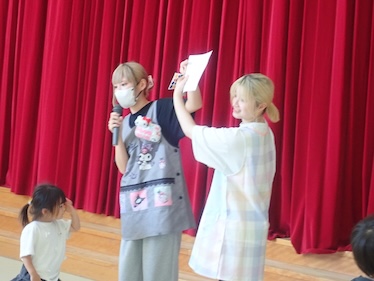 エプロンシアターではいろいろな形の食べ物が登場しました!正解者続出でびっくり!