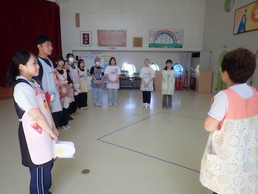 さて、学生の自己紹介から活動がスタートです! 「グーチョキパーで何つくろう」の手遊びから、「おいしい〇△▢レストラン」のエプロンシアター。子どもたちの反応を見ながらクイズ形式にするなど、臨機応変に演じました。いろいろな形に興味をもった子どもたち! 地面には大きな〇△▢の枠があります。続いて、ピアノに合わせ列車になって遊戯室内をくるくる周り、学生が言った形にお引越しです。最後は、自作の〇△▢の動物パズルや、シールを自由に使っての形づくりを楽しみました。シールで自分なりにいろいろな形を作る子どもたちの姿を見て、学生も大変学びになりましたもちろん、計画通りに上手くいくはずがありません。子どもや親さんの姿を見ながら、臨機応変に関わることが大切です。子育て支援や地域子育て支援実習での学びを活かし、さっと親子の輪に入ったり、一人でいる子どもに声を掛けたりと、学びの繋がりも実感しました。これからもこうした実践を通して、保育や子育て支援、素材との関わりなどについて学びを深めていきます!