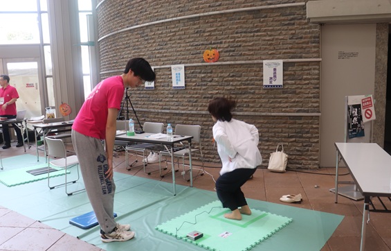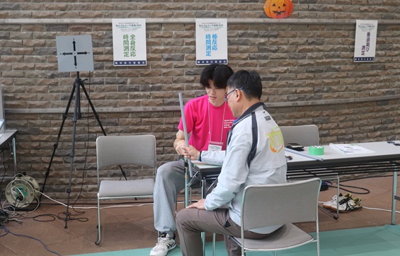 この教室は、選手、大会関係者や一般来場者に健康管理や体力づくり及び健康づくりの啓発を行うもので、垂直跳び、棒反応時間、全身反応時間の測定やヘモグロビン、血圧の測定を行い、測定結果に対する現状の分析や健康相談を行いました。