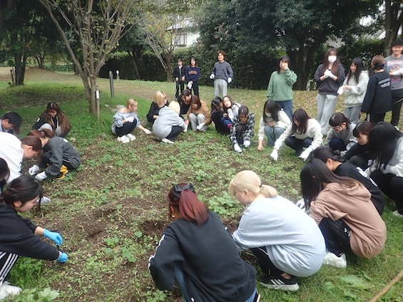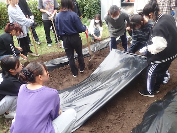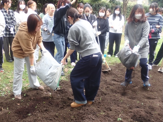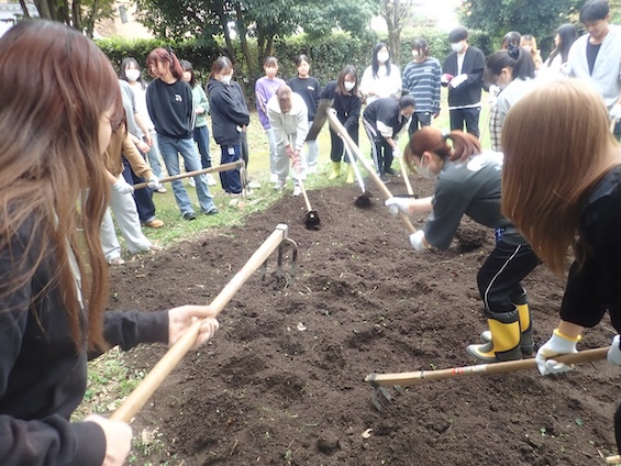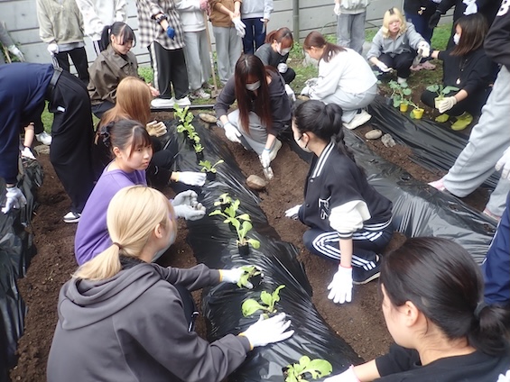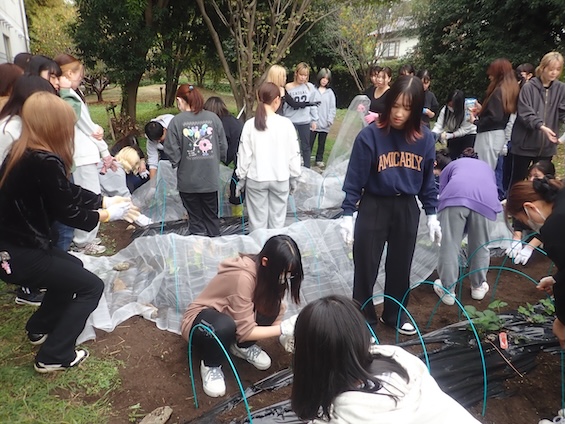 10月21日(火)の子ども教育学科幼稚園教諭・保育士コース3年生「保育内容(環境)Ⅱ」の授業では、野菜の栽培実習を行いました。今まで何を育てるか、それをどのように育てればよいのか、グループごとに考えてきました。畑に詳しいご家族に聞くなど、まさに子どもの気持ちになりきって「自分が育てた野菜を使って〇〇をしたい!」という目的意識をもって、探究していく姿がありました。当日は、小松菜・苺・白菜・大根・ブロッコリー・ホウレン草を土をイチから耕すところから行いました。当然、農作業など経験のない学生が多く、ネットなどの動画を見よう見まねで取り組む姿もありましたが、徐々に畑が完成してくると意欲もあがっていきました。協力して防虫ネットをつけたり、空き時間に再度種を植えたりと、日頃の活動にも繋がっていきました。野菜の成長は、一生懸命水をあげたり、雑草をぬいたり、野菜のことを気にかけて育てます。これはまさに子どもの成長そのものです。こうした活動を通して、実際の保育での援助のあり方や活動展開、そして、子どもの育ちに目を向けられるといいですね。これからの野菜と学生の成長が楽しみです!