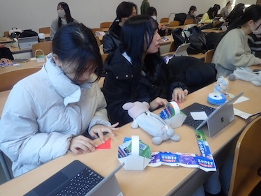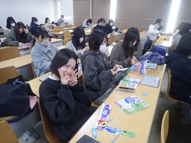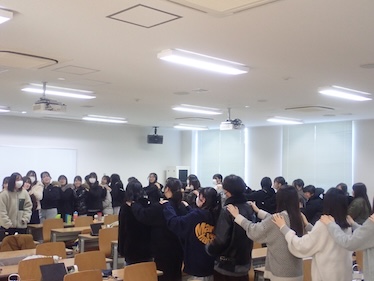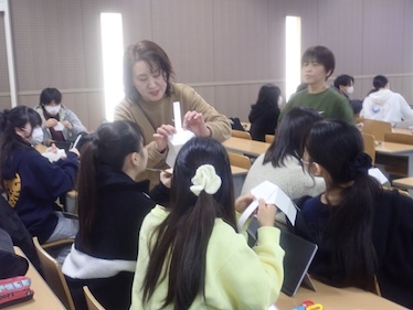 1月21日の子ども教育学科幼稚園教諭・保育士コース1年生の「保育現場参観」最終授業では、岐南さくら認定こども園の先生方をお招きし、様々な実践を通して保育への考え方を学びました。緊張していた学生も、先生の歌に合わせて手を叩きあうなどするうちに、知らない間に保育者としての表現ができるようになっていきました。手作りおもちゃでは、子どもの発達を考えながら保育者が願いを込めて作成することの大切さを教えていただきました。また、牛乳パックで節分の豆を入れるカバンの作成では、安全で、幼児が楽しく作ることのできる援助の方法について、子どもと保育者双方の視点から考えていくことの大切さを教えていただきました。初めての幼稚園教育実習が1月26日から始まります。本コースでは、これからも様々な方法を通して、充実した実習になるようサポートしてまいります。