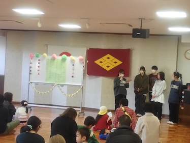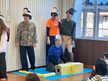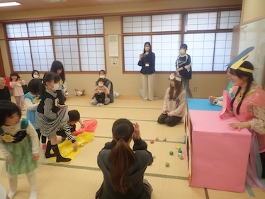 各務原市主催・川島地区社会福祉協議会の協力のもと、2月28日(土)に川島ライフデザインセンターにて「ひな祭り会」を開催しました。多くの申し込みの中から抽選を行い、年少から小学2年生までの親子30組にご参加いただきました。当日は天候にも恵まれ、暖かい気候の中で実施することができ、親子の笑顔や楽しそうな声があふれ、室内も温かい雰囲気に包まれていました。学生は、これまでの3年間の学びを活かし、授業内や空き時間を利用しながら、親子に充実した時間を提供できるよう企画・準備を進め、本日を迎えました。企画や準備の段階では、どのようにすれば親子が一緒に楽しむことができるかを考えながら、学生同士で意見を出し合い、丁寧に進めていきました。当日は、学生による挨拶とスタンプラリーの説明から始まり、ピアノ伴奏に合わせて参加者全員で「うれしいひなまつり」を元気よく歌いました。その後、ひな祭りについて楽しく学ぶことができる「ドラえもんとひな祭りのひみつ」のオリジナル劇を学生が演じました。子どもたちは楽しみながらひな祭りの由来や意味に触れ、会場は大盛り上がりでした。