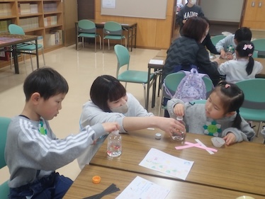 2つ目のブースは「あかりをつけましょ ぼんぼりに♪」です。ここではペットボトルや折り紙、テープなど豊富な素材を用意し、ぼんぼり作りの製作活動を行いました。子どもたちは自分の好みに合わせて色を選びながら、完成を楽しみにし、わくわくした気持ちで製作に取り組んでいました。完成後は部屋を暗くし、ライトの上に置くことで色がより鮮やかに浮かび上がり、子どもたちの表情には笑顔と驚きがあふれていました。
